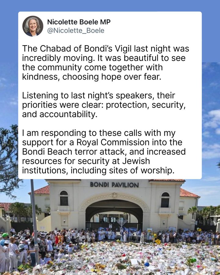 I am responding to these calls with my support for a Royal Commission into the Bondi Beach terror attack, and increased resources for security at Jewish institutions, including sites of worship.