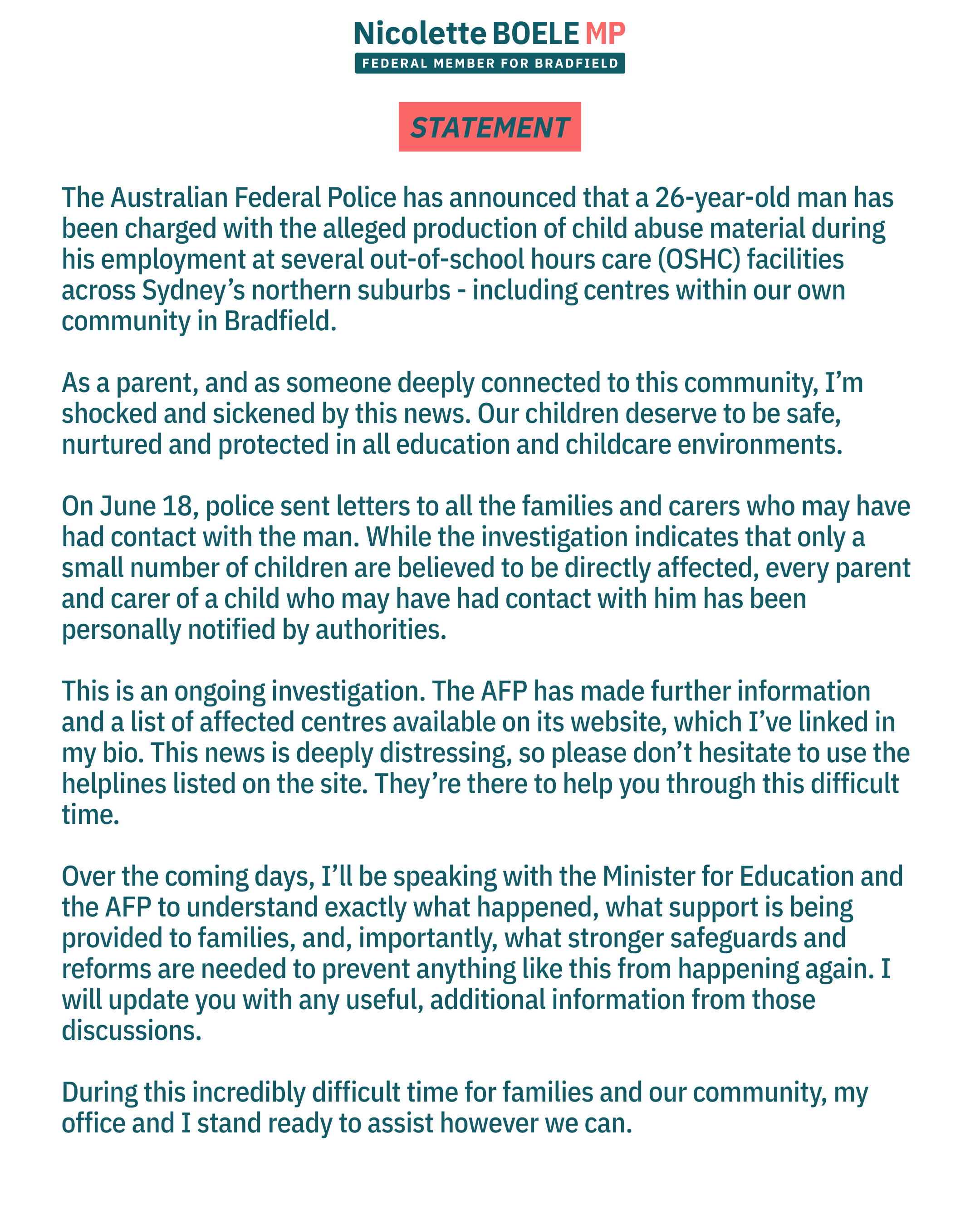 Over the coming days, I’ll be speaking with the Minister for Education and the AFP to understand exactly what happened, what support is being provided to families, and, importantly, what stronger safeguards and reforms are needed to prevent anything like this from happening again. I will update you with any useful, additional information from those discussions.